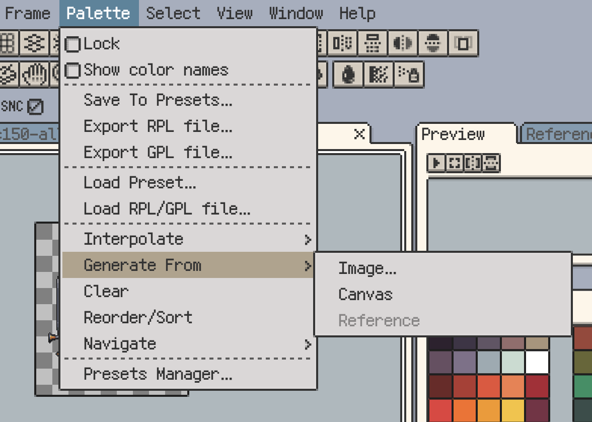 Use Menu ▸ Palette ▸ Generate From to build a palette directly from the canvas, a reference image, or an imported picture.