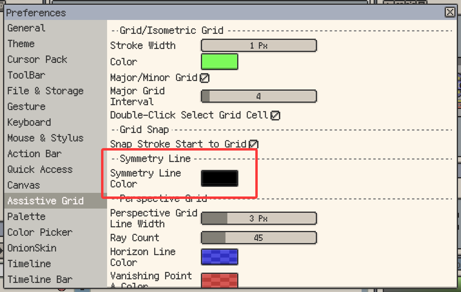The symmetry line color can be adjusted in the Assistive Grid related settings.
