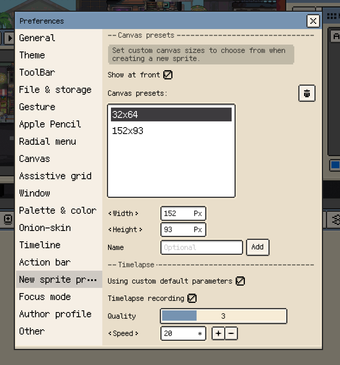 If you want the drawing process recorded from the start, timelapse can be configured while the sprite is being created.