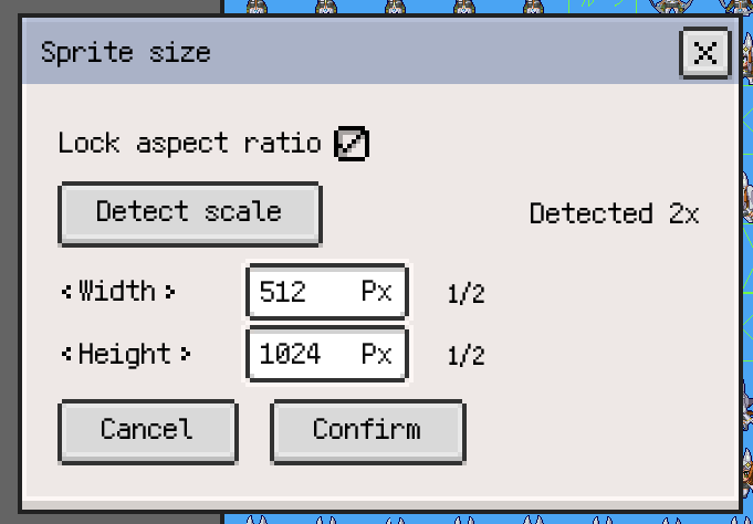 - New: Added Detect Scale to the Sprite Size dialog. It can try to detect the integer upscale factor of the current frame and automatically fill in a width and height that are better suited for continued pixel-by-pixel editing.