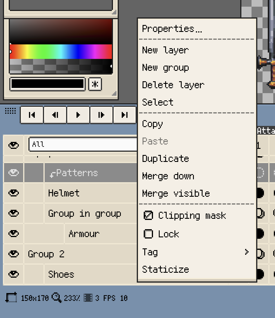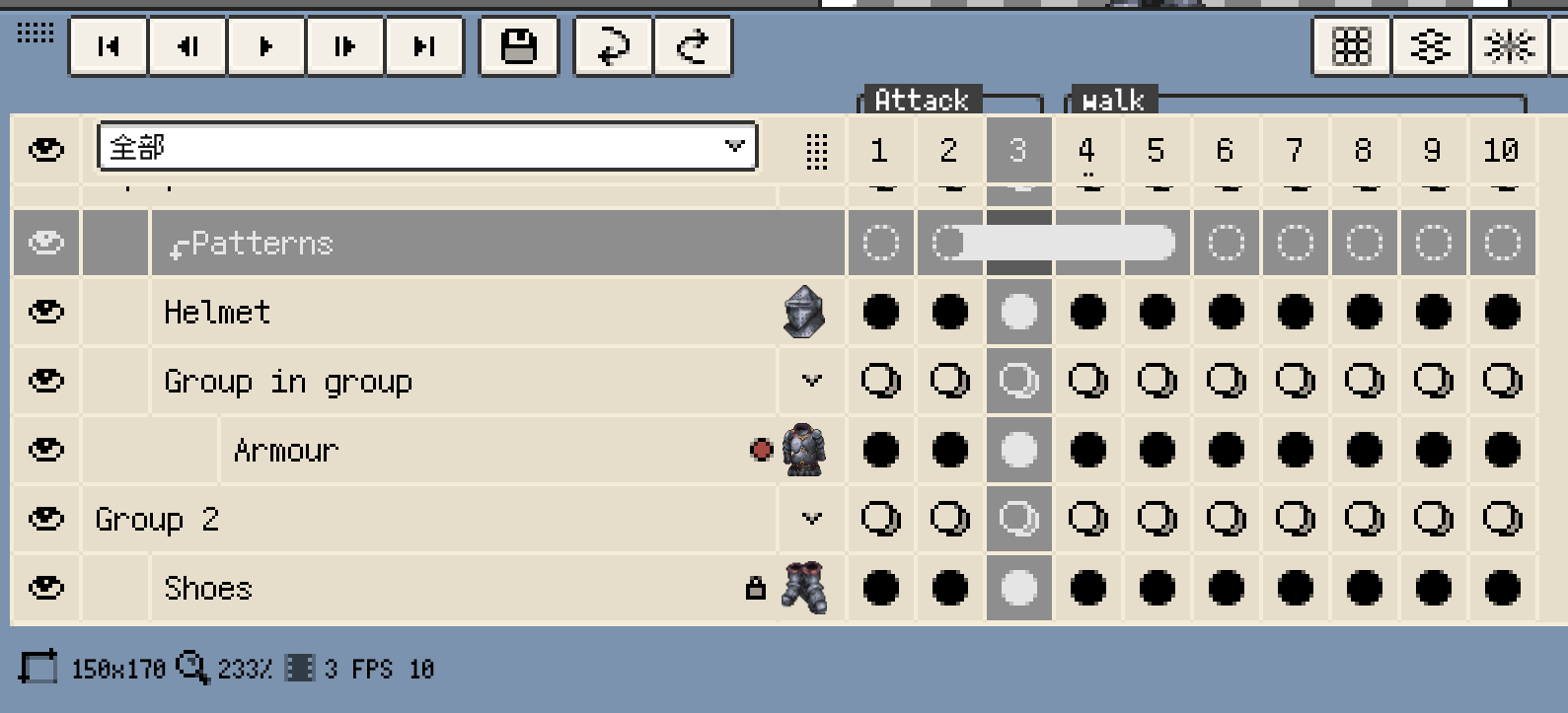 目アイコンを長押しすると、現在のレイヤーやグループだけを一時的に表示する使い方もできます。キャラクター、影、効果などを単独で確認したいときに便利です。