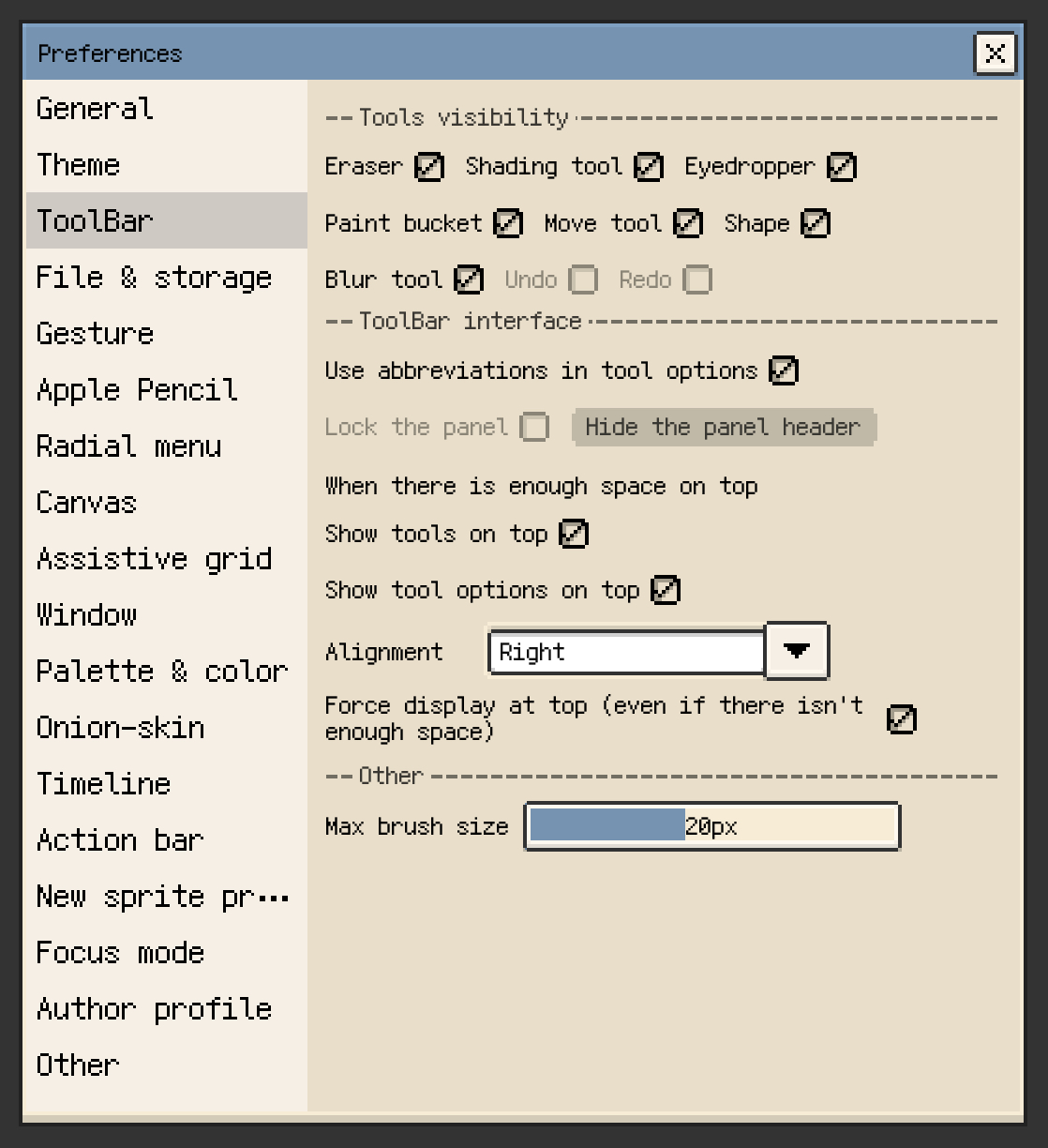 Resprite 的绘制体验由两部分组成:一部分是工具栏本身,另一部分是当前工具对应的选项。不同平台的布局方式不完全相同,建议先把工具栏摆到顺手的位置,再去熟悉常用工具。
